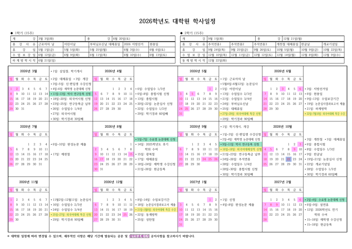 2026학년도 대학원 학사일정 확정 및 알림